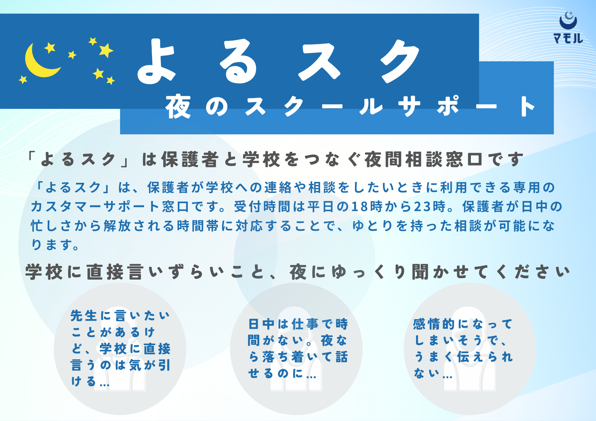 株式会社マモルの代表のくまゆうこです。学校の夜間電話対応サービス『よるスク』について、