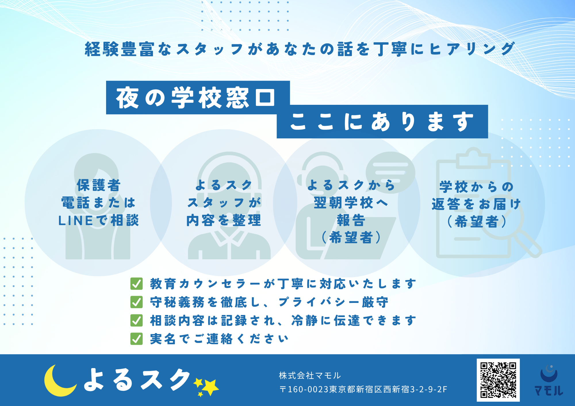 そこで私たちは、「先生を守ることで、結果的に子どもたちを守る」ことを信念に、夜間だけ学校の電話を代わりに受ける『よるスク』を立ち上げました。『よるスク』では、教育に理解のある専門スタッフが丁寧にお話を伺い、必要に応じて翌日に学校へ報告します。これにより、教員の私生活や休息時間を守りつつ、保護者の不安にも真摯に向き合うことができます。